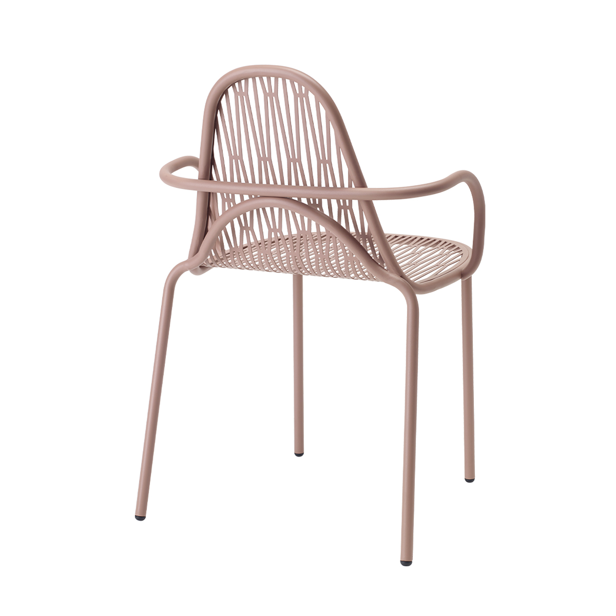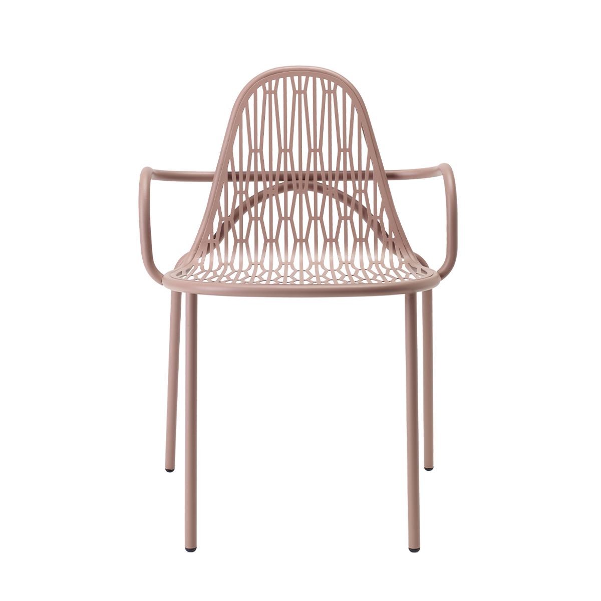 Despite its apparent simplicity, its design expresses a true production challenge: to extract the backrest and seat from a single perforated and calendered piece, and then weld them almost invisibly to the tubular frame. A particularly complex treatment that brings the metal close to its flexibility limit and softens its impenetrable coldness. Evoking the warp and weft of a fabric, but also the play of shadows of a tree canopy, Malvasia is a seat that lends itself to animate any outdoor space, even terraces and gardens. The legs, characterized by a double curve, give poetic lightness to the furnishing, whose minimal profile is completed by the addition of armrests and soft cushions.