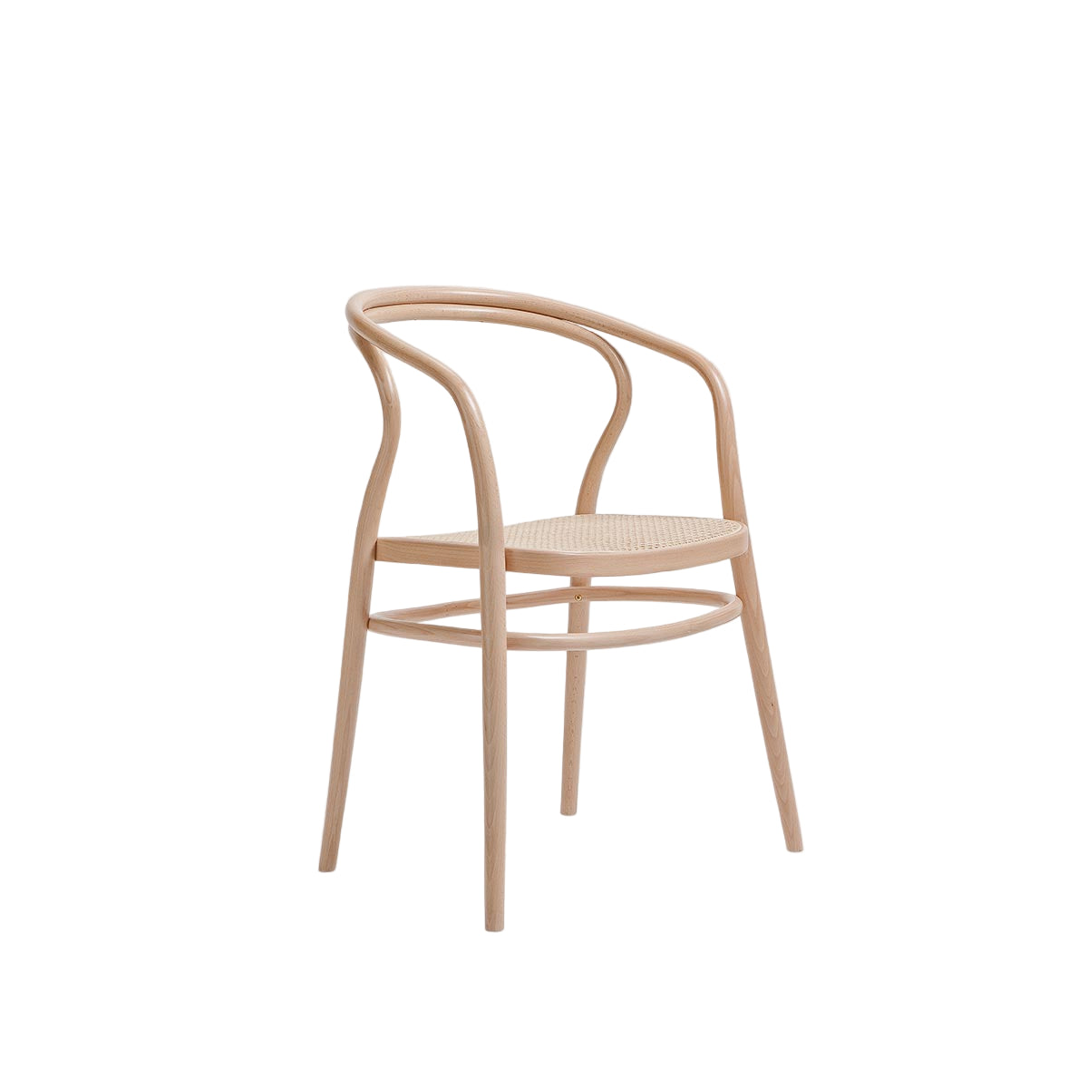 The B-1400 armchair stands out within its family for the striking way its front and rear legs converge at the top of the backrest. Crafted from bent beech wood, it is a remarkably lightweight piece whose broad, comfortable seat is perfectly balanced against its minimalist frame, composed of just two beech rods. Despite its refined simplicity, the B-1400 offers versatility, with the option to line the seat in a woven mat or upholster it in fabric, echoing the possibilities of its companion chair.