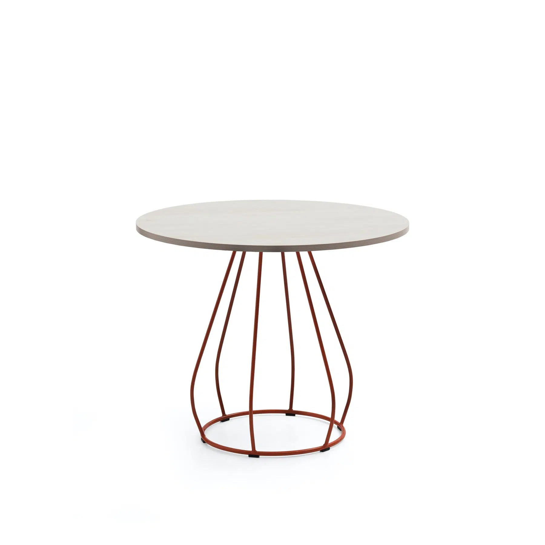 Set of cafeteria and auxiliary tables. Design that is composed of a central foot formed by a series of curved rods, which are joined to two rings, defining a very light and resistant body, which supports an MDF top covered in natural veneer or melamine.